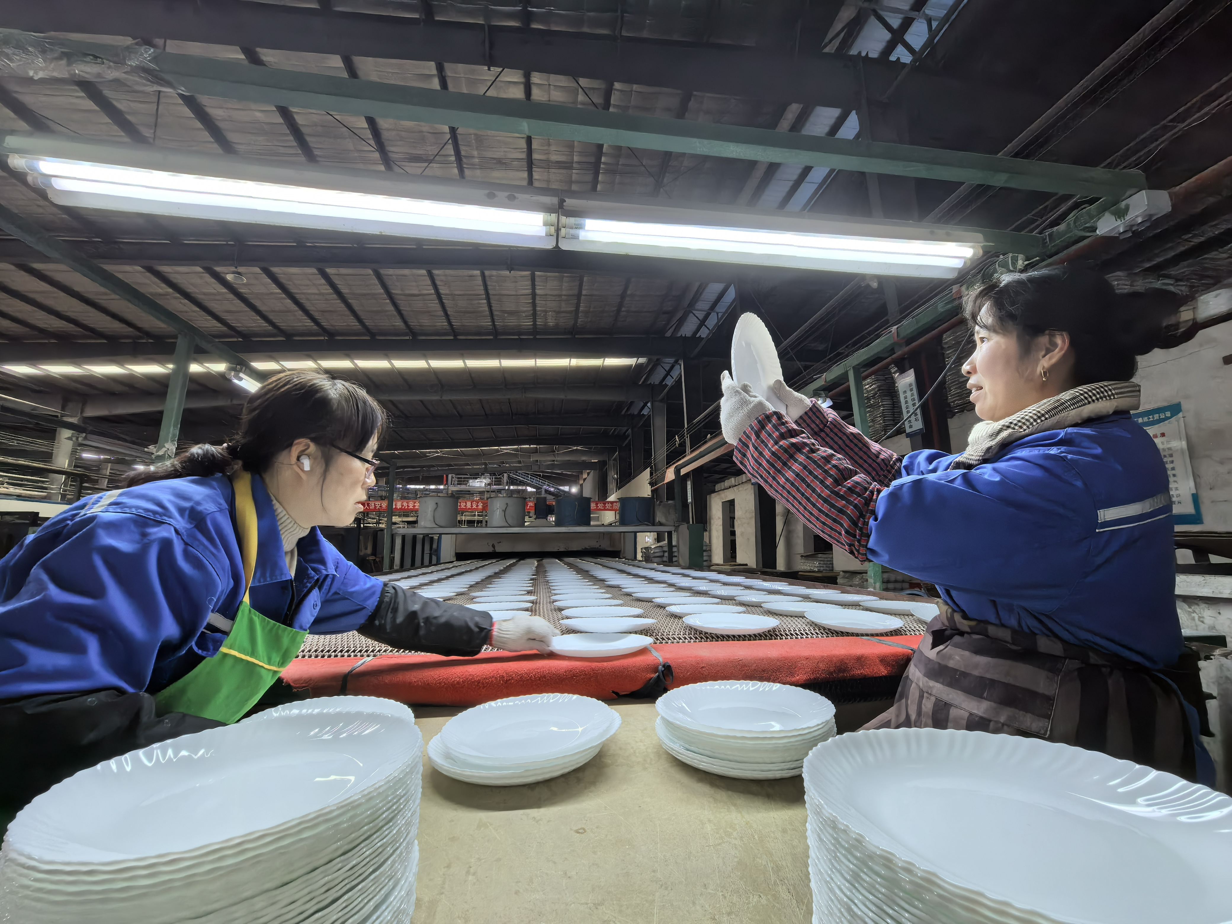 传送带上,一只只乳白透亮的胚盘、胚杯稳稳向前。工人站在操作台前,对着白炽灯光快速质检,不合格的随手投入箱中,粉碎、回炉。行走在车间里,杯碟清脆的撞击声此起彼伏——“这支‘锅碗瓢盆’交响曲,春节期间一天都没停。”车间主任黄海笑着说。