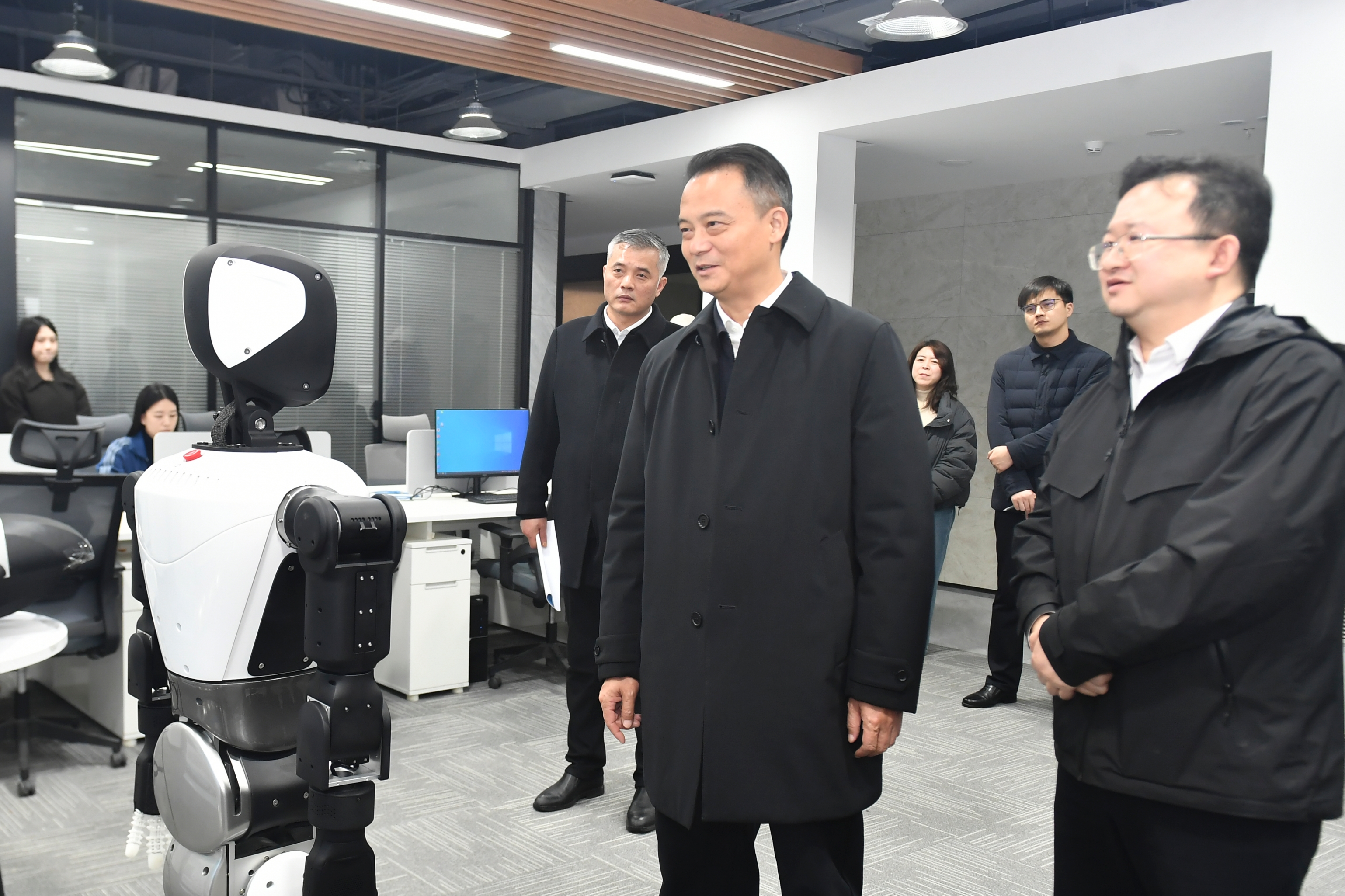 周锋先后深入已入驻咸宁科创中心的武汉大学工业科学研究院咸宁分院、湖北省灵醒云科技有限公司,仔细观看相关科创项目演示,和科研团队负责人深入交流,了解团队研究方向、研发进展、科研成果及转化应用等情况,听取他们对科创中心服务保障、加快推动科研成果转化应用等方面的意见、建议。