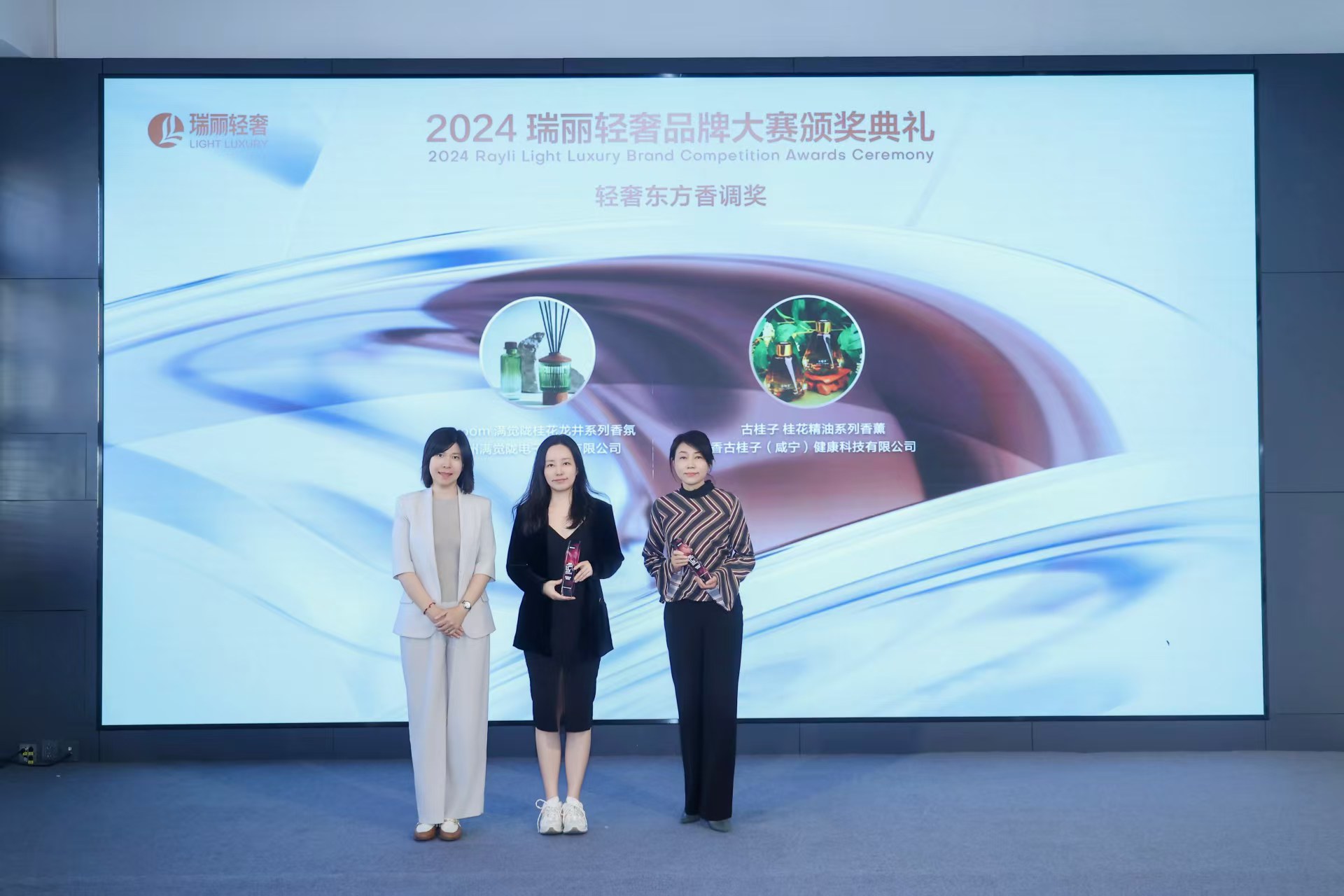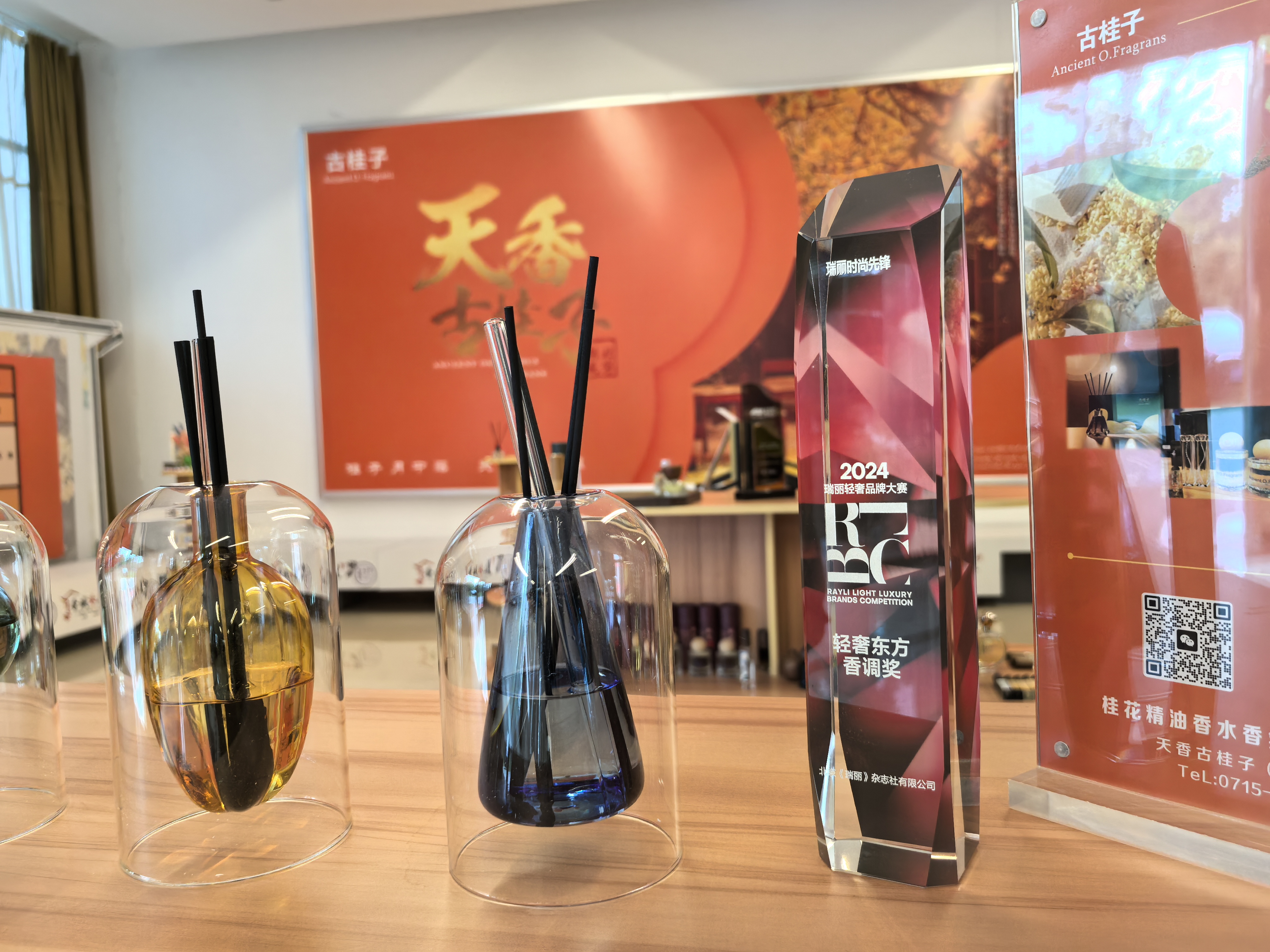 细数企业至今获得的各项荣誉:桂花精油无火香薰获得2024年度瑞丽轻奢品牌大赛“轻奢东方香调奖”,桂花精油礼遇香片获“咸宁游礼”奖项,桂花精油无火香薰入围行业权威的“金桂奖”……这些奖项无不见证了“古桂子”这一地方品牌的高质量蜕变。