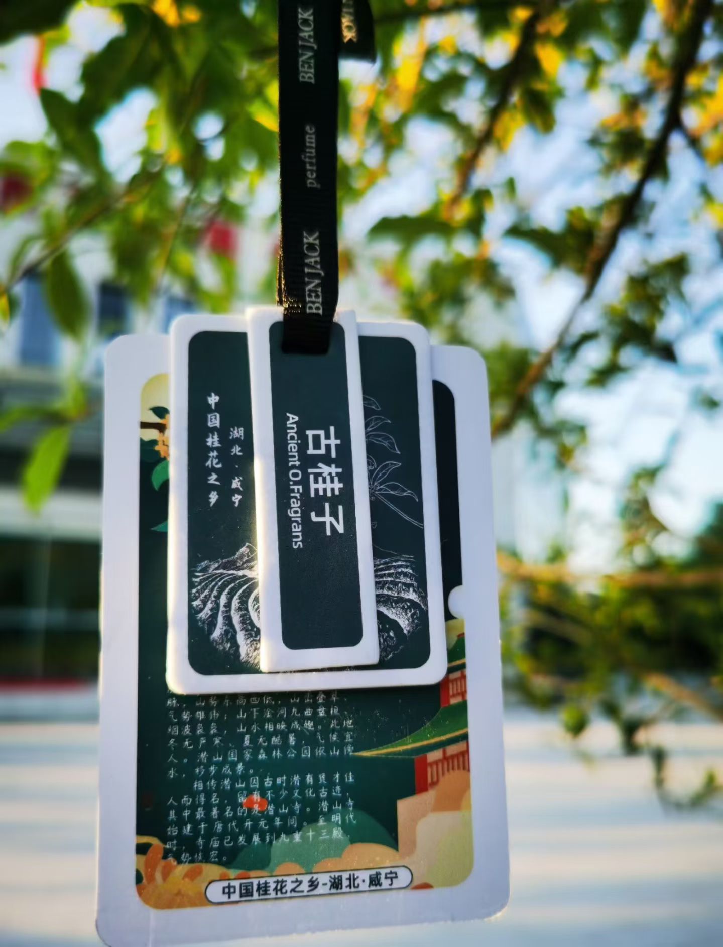 在古桂子公司的产品展示厅内,一套设计精美的“桂花精油礼遇香片”也吸引着访客的目光。香片上印着咸宁八大景点的精美图案,背面配有古诗文,巧妙地将地方文旅与产品创新融为一体。
