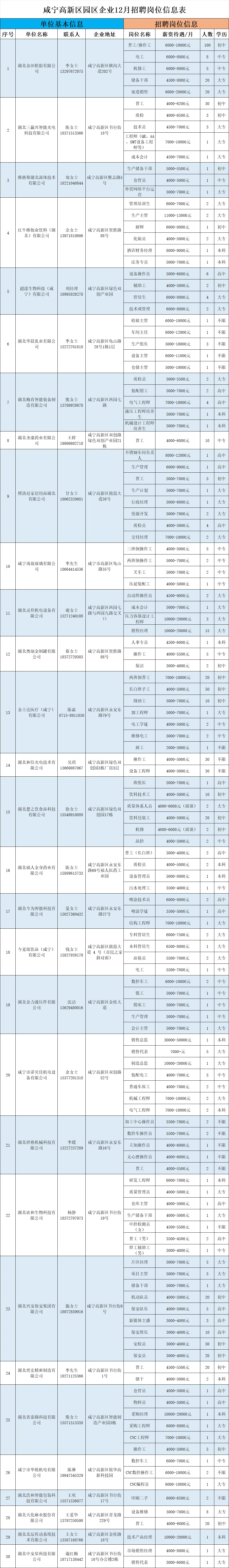 > 咸宁高新区园区30家企业12月份招聘信息岗位表