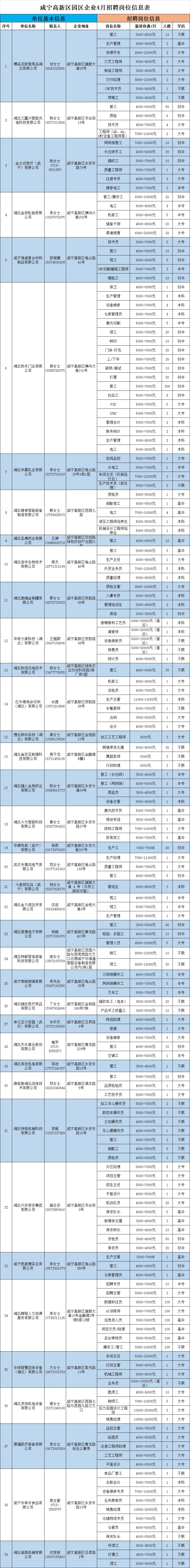 > 咸宁高新区 园区39家企业招聘信息(附岗位表)
