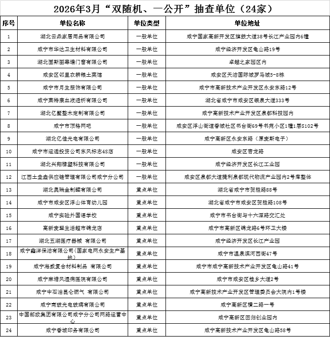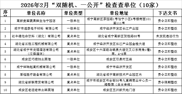 根据“双随机、一公开”消防监管工作要求,咸宁高新技术产业开发区消防救援大队现将“双随机、一公开”2026年3月份抽查名单,2026年2月份检查结果公示如下:
