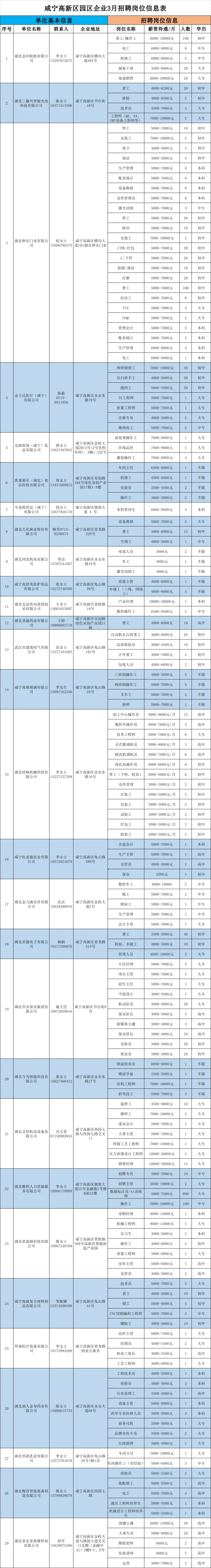 名 称: 咸宁高新区2026年3月 园区29家企业招聘信息(附岗位表) 发布日期: 2026年03月09日