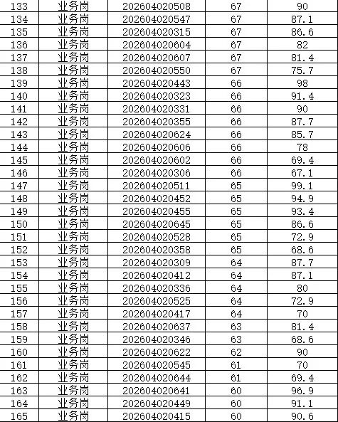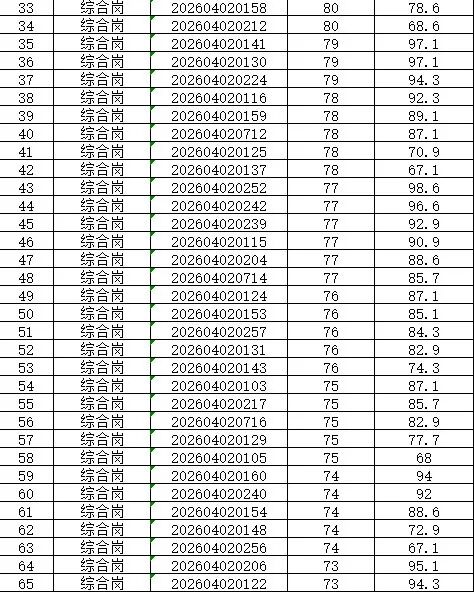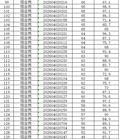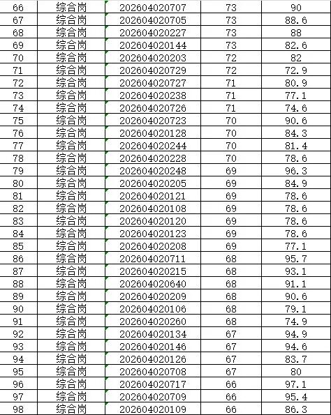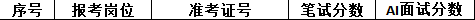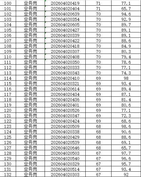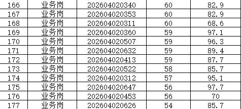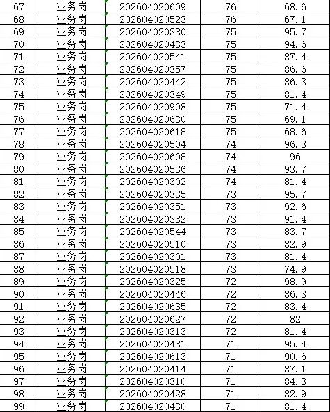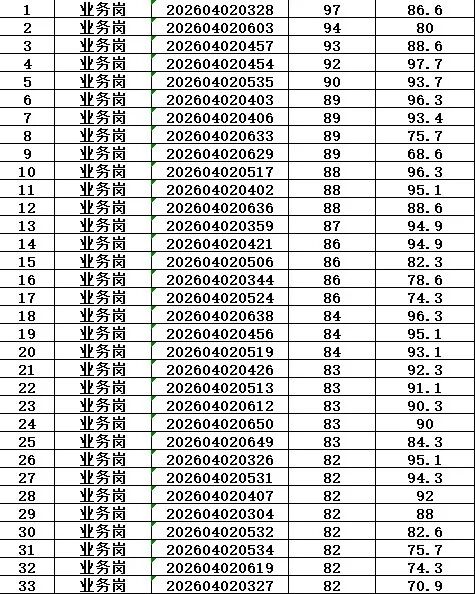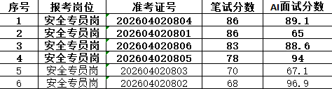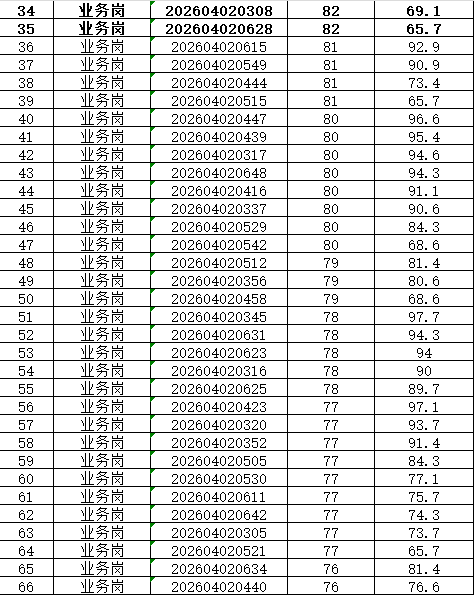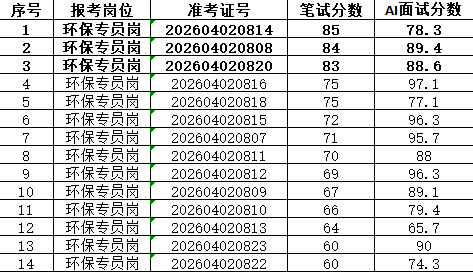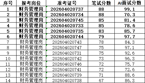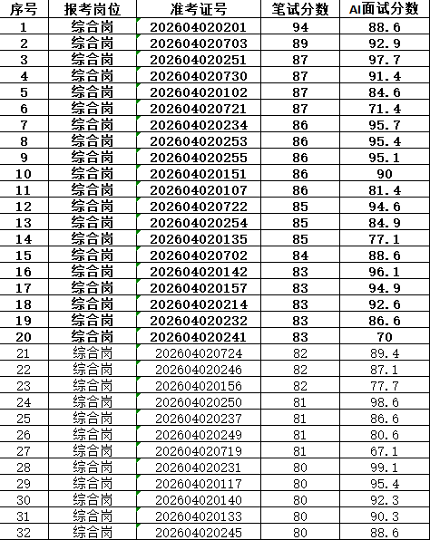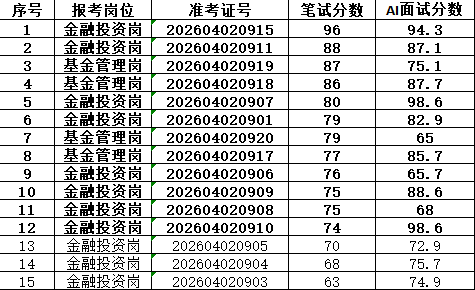 本次招聘笔试成绩公告如下,按岗位进行笔试分数从高到低排名划定入围人员,笔试同分看AI面试分数,笔试成绩低于最低合格线72分者,不能进入面试环节。对于招聘岗位计划招聘数与面试当天实际参加面试人数比例小于1:3的岗位,考生面试成绩须达到当场面试(同一场次,同一考官组)平均分以上,方能进入下一环节。