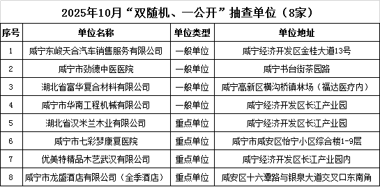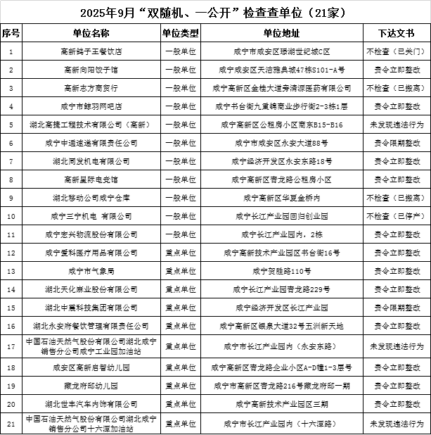 根据“双随机、一公开”消防监管工作要求,咸宁高新技术产业开发区消防救援大队现将“双随机、一公开”2025年10月份抽查名单,2025年9月份检查结果公示如下: