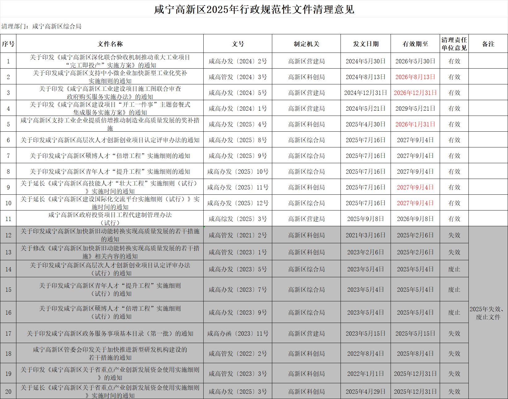 名       称: 咸宁高新区2025年行政规范性文件清理意见 发布日期: 2026年01月15日